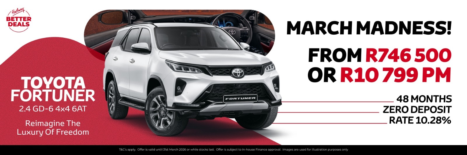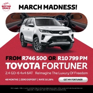 Our March Madness offer is designed to make ownership simpler and more affordable than ever before. For this month only, we are offering the Toyota Fortuner 2.4 GD-6 4x4 6AT starting FROM R746 500.